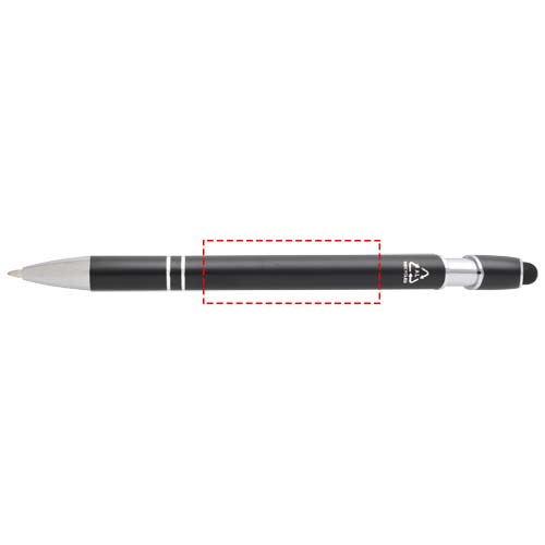Der Kish Kugelschreiber in Silber hat einen Schaft aus recyceltem Aluminium und einen Stylus aus Silikon. Recyceltes Aluminium reduziert die Menge an Deponiemüll, schont die natürlichen Ressourcen und reduziert die Treibhausgasemissionen. Tintenfarbe: Blau. Schreiblänge: 800 Meter. Schreibspitze: 1 mm.